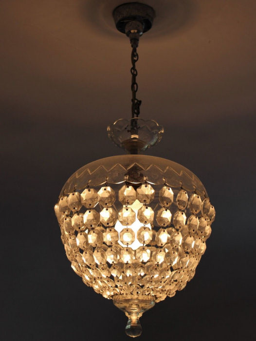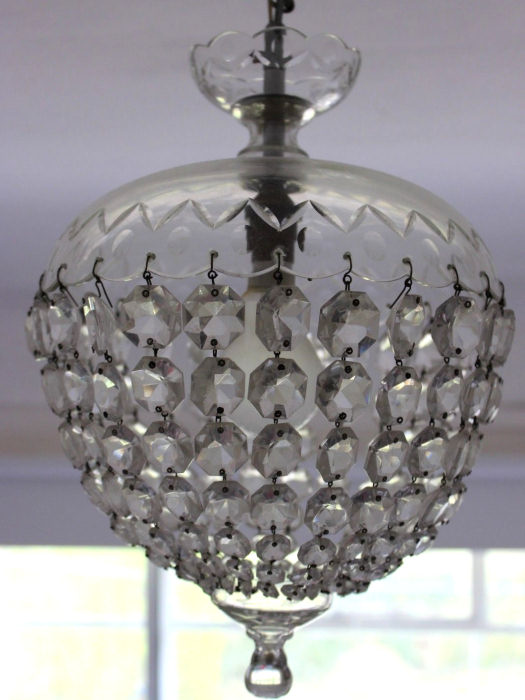 Circa 1930 Crystal Chandelier Perfect for low ceilings, this lovely crystal chandelier dates to 1930. This beautiful purse shaped chandelier is compact and easy to install. The beautiful strings of hexagonal crystal drops are attached to a dome shaped glass top with upturned crystal dish (which can be fitted straight to a ceiling hook where height is an issue or extra chain can be added). The purse is made by attaching the strings of crystals to a glass dish. Rewired and ready to install. Height TBC Width 26cm PRICE £275 DELIVERY £10.00 CHA3044
