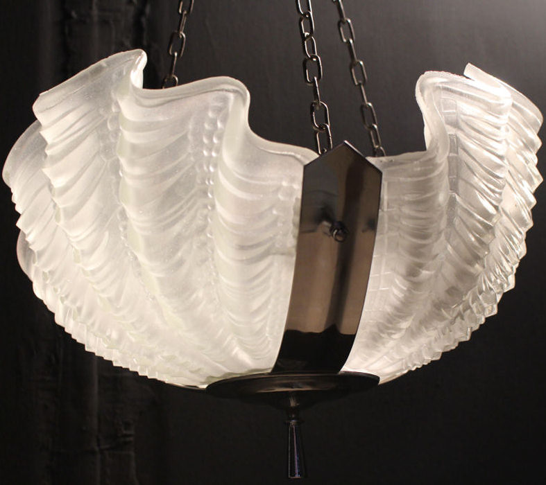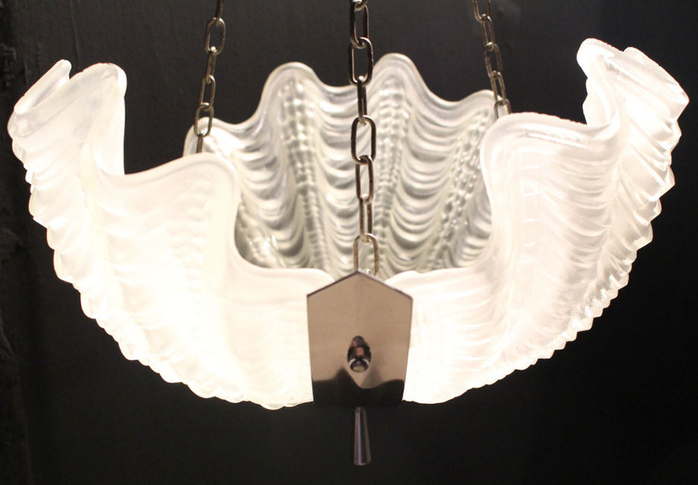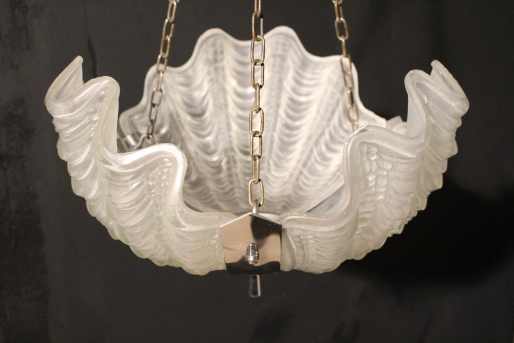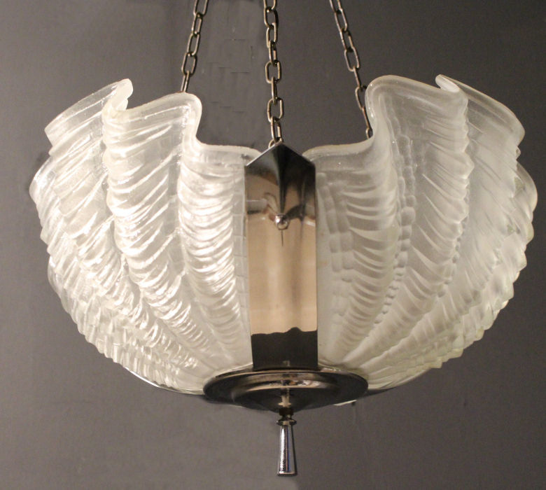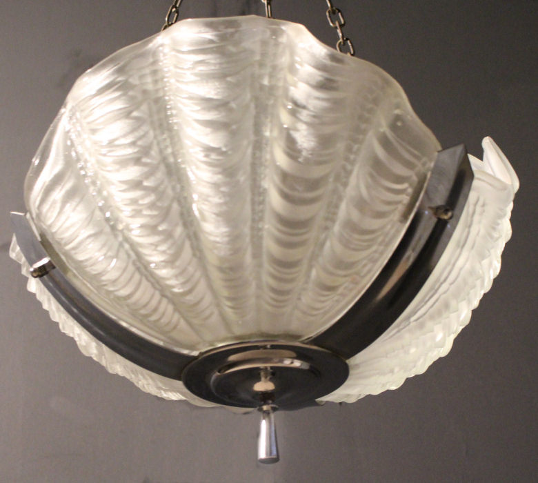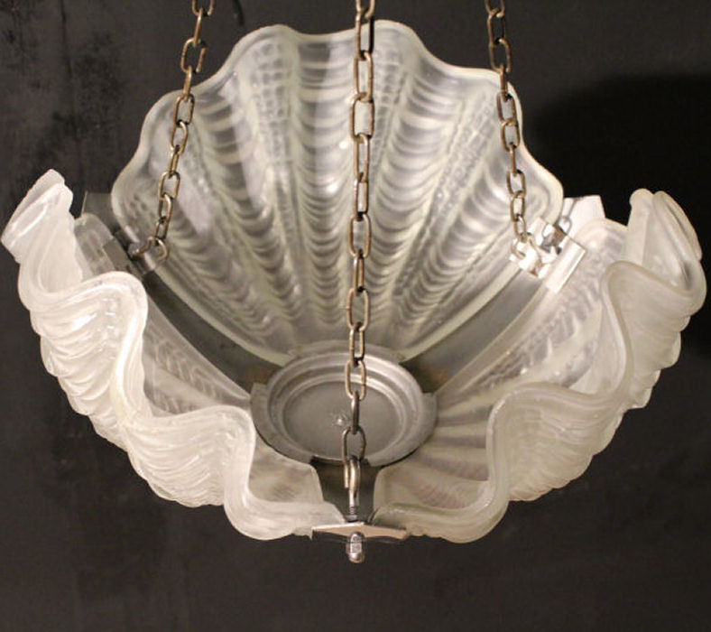 Art Deco Opaque Shell Ceiling Light A gorgeous Art Deco Ceiling light, the crome surround in very good condition, holds the 3 opaque shells firmly in place. These are all in excellent condition. Rewired with antique gold silk flex and chrome bayonet this is ready to install. Width 14" Height 8.5" (plus chain and hook) Ref CHA3045 £275 Delivery £12