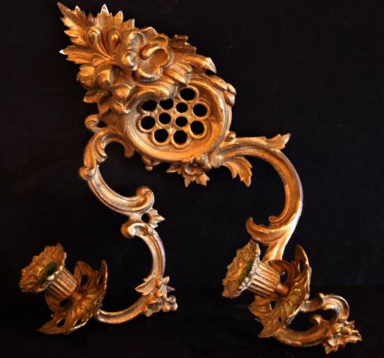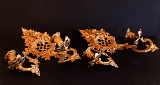Pair of Decorative Edwardian Wall Sconces These lovely 2 arm wall sconces have wonderful decorative quality, lots of embossed detailing to the frames, in the form of leafs, petals and flowers, they are very unusual with double arms and can be used as they are for candles or rewired if preferred. Height 15" Depth 6.5" Price £295.00 if rewired £350 (Ref:CHA325) Email Us for a delivery quote : Click Here