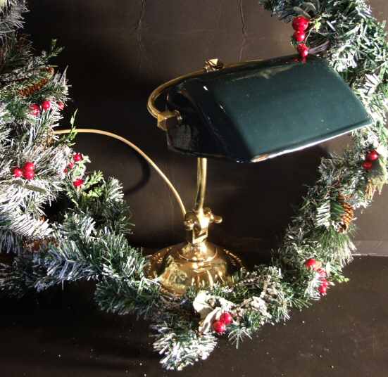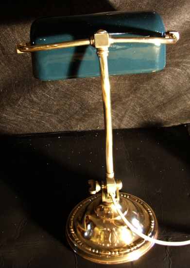 Antique Adjustable brass bankers desk lamp A fully adjustable antique brass desk lamp with circular base and adjusting slender stem terminating in a glass green shade which also tilts. In excellent condition, fully buffed and wired. £275 (Ref:CHA503) Email Us for a delivery quote : Click Here