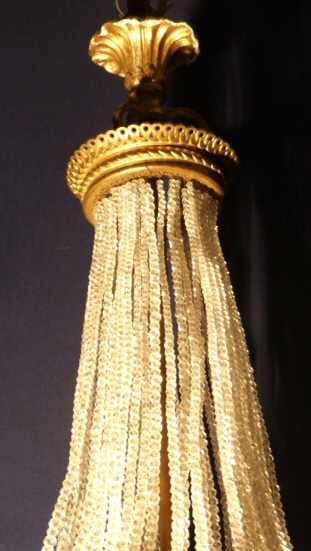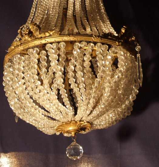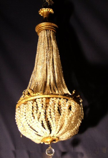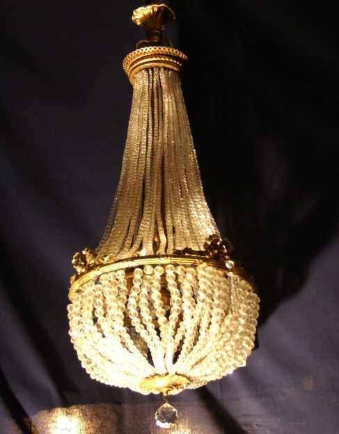 Stunning Victorian glass crystal Purse Chandelier A fabulous example of a Victorian purse/bag chandelier with brass rim with decorative ribbon swag detail from which icicle drops hang. The purse is constructed from strands of different sized glass beads (original and period ) hung from the reeded brass frame all held in place by a beautiful brass foliate fitting from which a faceted glass ball hangs. The elegant glass beads forming the slender neck of this wonderful light are so elegant and very classical in style and shape. The chandelier has its own original brass rose and is larger than most chandeliers of this style having 3 bulbs. The amount of glass on this wonderful chandelier ensure that the bulbs are almost hidden and just produce the most wonderful opulent feel. This is a Victorian example and not a 1930s copy and is a must for any period home. Height 34" minimum Width 16" Price £1,295 (Ref :CHA509) Email Us for a delivery quote : Click Here