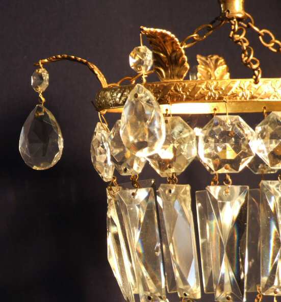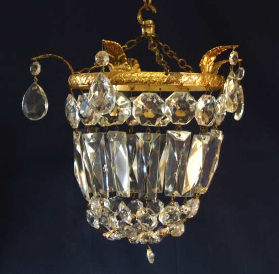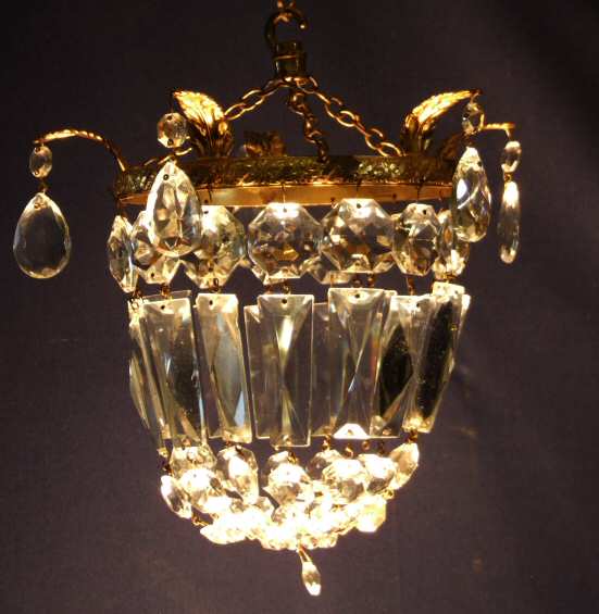 Small Edwardian Purse Chandelier A lovely example of a small Edwaedian purse chandelier with hexagonal faceted drps and rectangular faceted drops making up the bag. The rim having 5 accanthus leafs dressingit with further faceted almond drops hanging from these. A lovely little chandelier Width 6.25" Height 10" to top of hook plus chain Price £195 (Ref : CHA514) Email Us for a delivery quote : Click Here