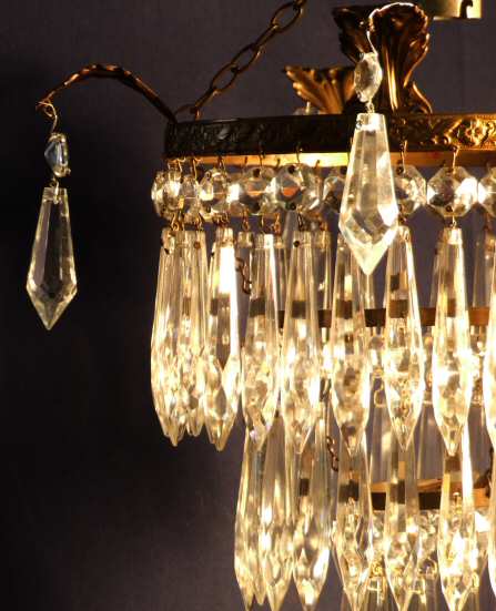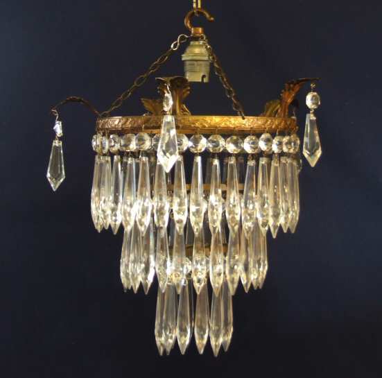 Beautiful Edwardian 3 tier icicle chandelier A lovely Edwardian 3 tier icicle antique chandelier. The 3 tiers of icicle drops sparkle beautifully from the patinated brass rim which has 5 large well defined accanthus leafs dressed with further sparkling drops. Width 8.5" actual rim 11.25" from ear to ear Height 14" to top of hook plus chain Price £295 (Ref : CHA515) Email Us for a delivery quote : Click Here