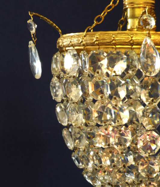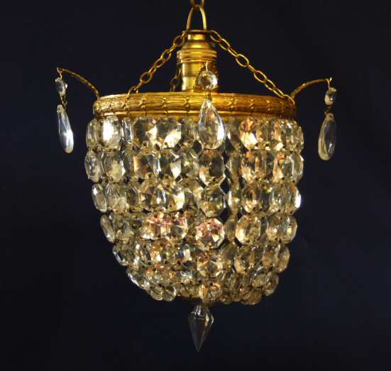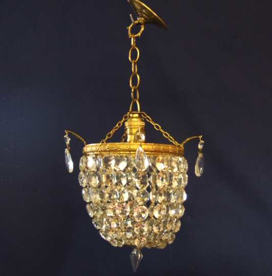 Fantastic Full Sparkling Edwardian chandelier A very beautiful and full sparkeling chandelier of purse construction loaded with fantastic faceted drops that reflect the light wonderfully.The bright gilt rim has accanthus leaf dressed with faceted almond drops. This lovely chandelier also has its original ceiling rose. A beautiful example. Width 6.5" actual rim 9" from ear to ear Height 11" to top of hook plus chain Price £225 (Ref : CHA516) Email Us for a delivery quote : Click Here