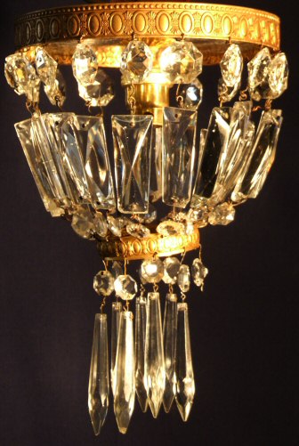 Tiny Edwardian Platformier Chandelier A very sweet Edwardian platformier chandelier with single bulb, the bag made of alternate rectangular faceted drops and hexagonal faceted drops with pretty brass rim at the top of the "bag" and at the bottom from where further icicle drops hang to add a little something special. A lovely little chandelier Width 6.75" Height 11" to top of hook plus chain Price £185 (Ref : CHA518) Email Us for a delivery quote : Click Here