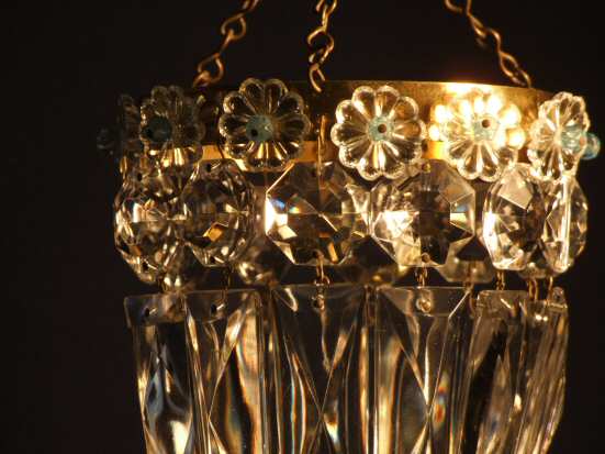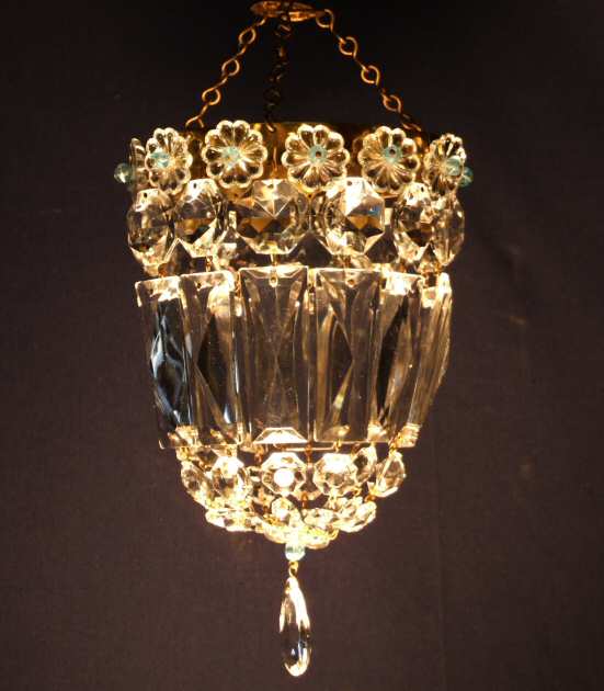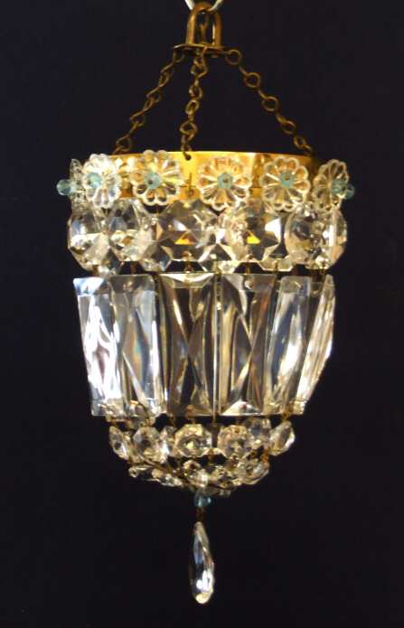 Small Edwardian Purse Chandelier A very cute little purse chandelier, the rim being dressed with glass floral drops with baby blue glass centres. Really sweet and very pretty. A lovely little chandelier Width 5.5" Height 11" to top of hook plus chain Price £165 (Ref : CHA519) Email Us for a delivery quote : Click Here