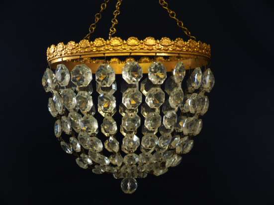 Circa 1930 a pretty purse chandelier A useful size this pretty purse chandelier with faceted hexagonal flat back drops terminating in pretty faceted crystal ball. The attractive accanthus detailing to the rim make this pretty light a lovely feature for any room. Width 7.5" Height 12" to top of hook Price £165 (Ref : CHA520) Email Us for a delivery quote : Click Here