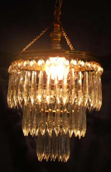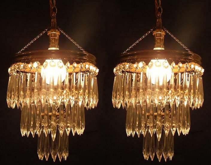 Pair of Matching mid 20th Century Icicle chandeliers A matching pair of mid 20th Century Icicle chandeliers. The bright brass frames are dressed with 3 rows of sparkling icicle drops. Getting increasinly difficult to find pairs of antique chandeliers |