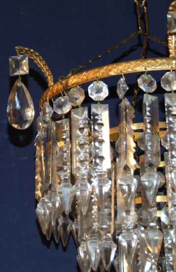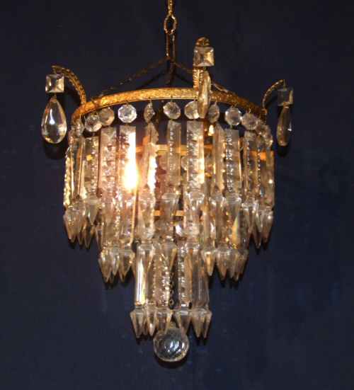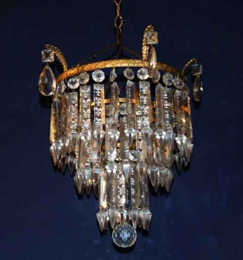 1930 Antique chandelier A beautiful 3 tier antique crystal chandelier dating to 1930, the 3 rows of "albert" drops sparkle beautifully from the bright gilt frame with accanthus leaf decoration to the rim and further faceted almond drops suspended from these. To the bottom of this is a faceted glass ball. Very elegant and a just a little special. Rewired and ready to install Height 14" minimum plus chain Width 10" £475