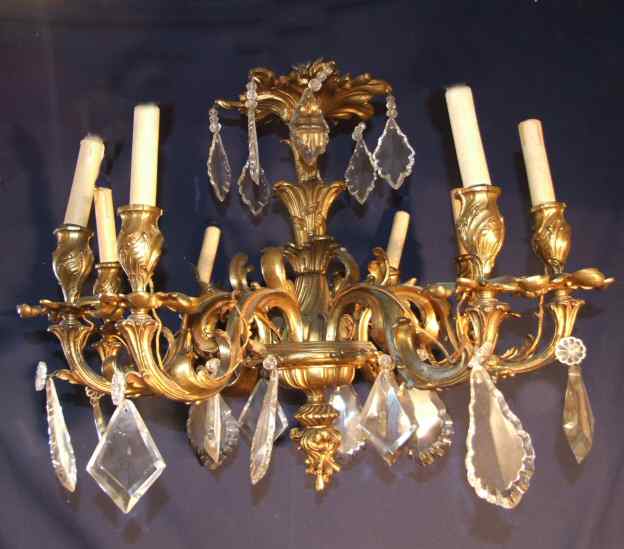 Large French antique Roccoco brass chandelier A stunning 8 arm antique French gilt brass chandelier dating to circa 1930, this heavy impressive chandelier oozes quality with highly curved arms with accanthus detail and large faceted crystal drops dressing each arm. The whole of excellent quality and wonderful detail. This will be rewired included in the price. Further photos to follow.