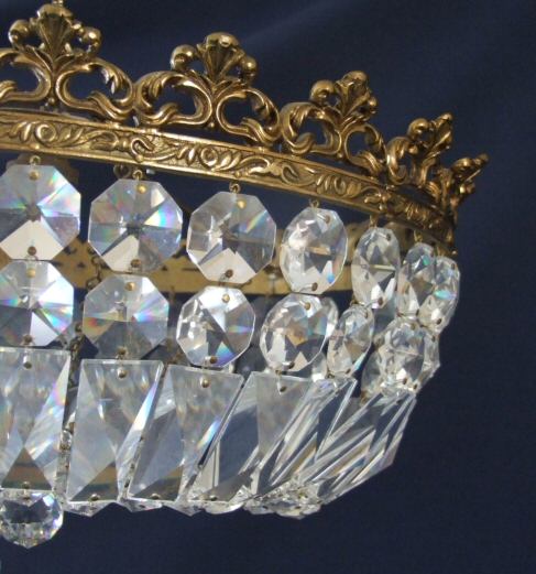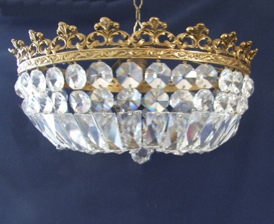 Large Antique bag chandelier A very pretty larger than average antique bag chandelier ideal for low ceilings. The frame with beautiful accanthus detailing dressed with rectangular faceted drops and hexagonal flat back drops which sparkle beautifully as the light hits them. This is wider than the majority of purse chandeliers and so will suit most sie of rooms. Width 15" Height 9" minimum £395 (Ref : CHA550) Email Us for a delivery quote : Click Here