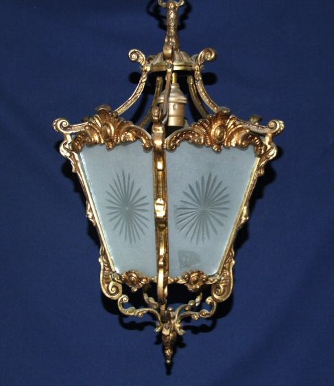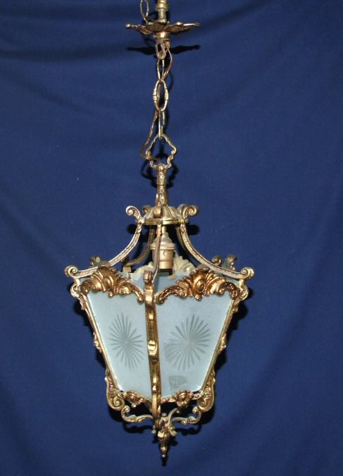 Circa 1930 antique brass hall lantern A pretty brass hall lantern dating to 1930 with rococco style ornate frame holding 4 frosted glass panels. The whole rewired and ready to install in lovely original condition. tbc £135 (Ref : CHA553) Email Us for a delivery quote : Click Here