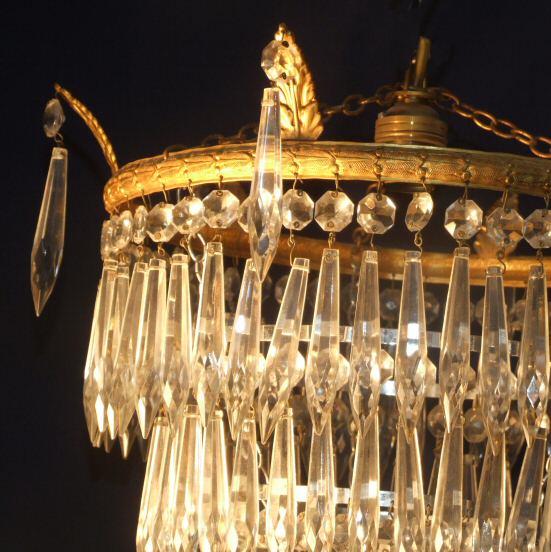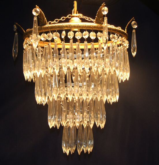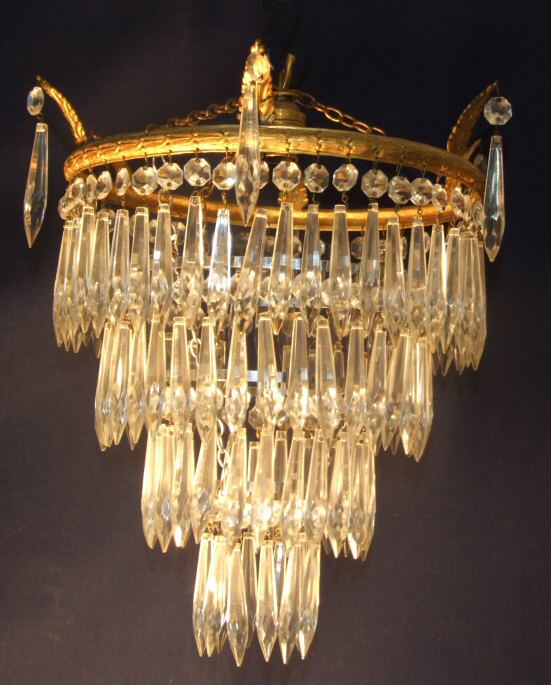 Stunning Edwardian 4 tier icicle drop chandelier A beautiful 4 tier "icicle" drop chandelier, the bright gilt frame with 6 accanthus leafs decorating it dressed with further "icicle" drops simply oozes elegance. The 4 tiers of faceted icicle drops reflect the light wonderfully and the whole is rewired to take up to 100 watt bulb allowing the light to be reflected beautifully creating a lovely rainbow effect across your ceiling.