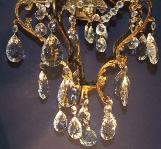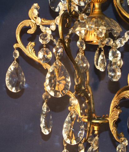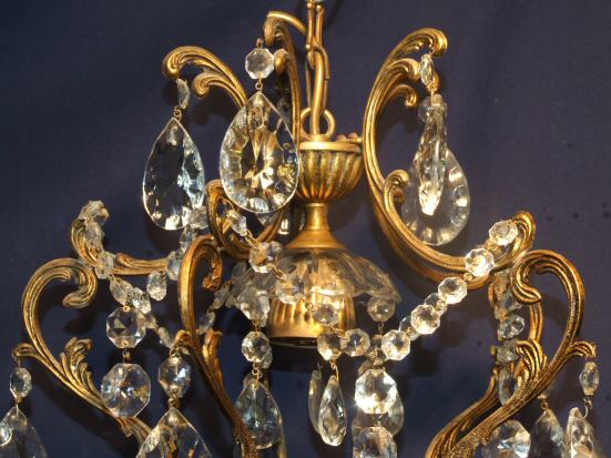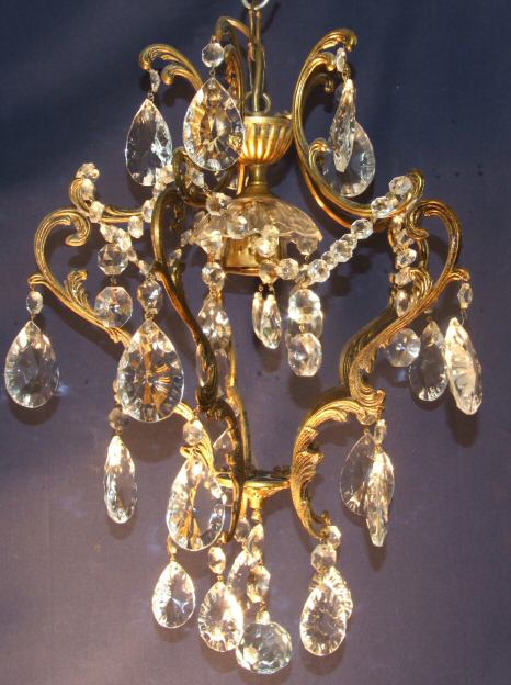 Elegant antique brass cage chandelier A pretty antique brass cage chandelier dressed with faceted almond drops and swags of hexagonal flat back crystals. A useful size would double as a hall lantern. Rewired and ready to install. H 1.5" min plus chain Width 8.25" Price £395