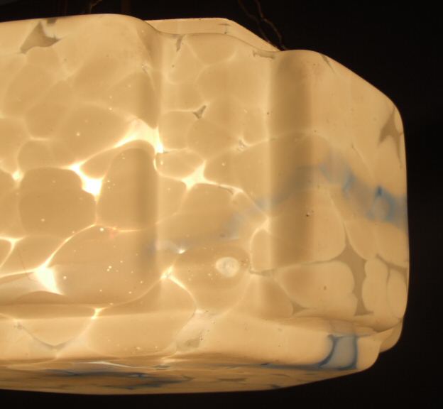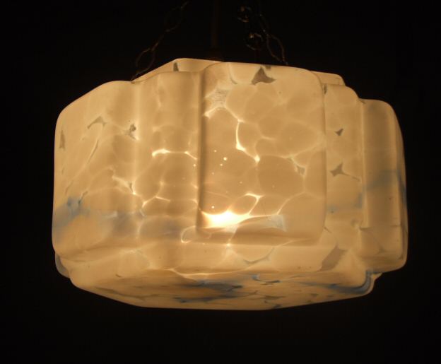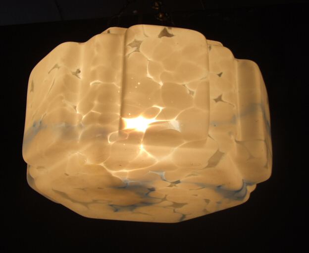 Geometric mottled blue and white deco lampshade A stunning lampshade dating to 1930 the 6 breakfronted panels in white and blue mottled decoration make this truly striking and very "Deco" the blue running through the shade give a lovely atmospheric feel when the bulb is on. Height 7" shade sides plus chain Width 12" £145 (Ref : CHA562) Email Us for a delivery quote : Click Here