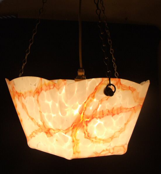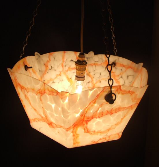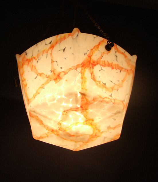 Striking Mottled peach "deco" lampshade A striking mottled peach and white deco lampshade with 6 high sides. Beautiful shape typical of the Deco era. Very atmospheric and attractive. Height 7" shade sides plus chain Width 14.25" £145 (Ref : CHA565) Email Us for a delivery quote : Click Here
