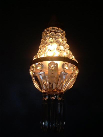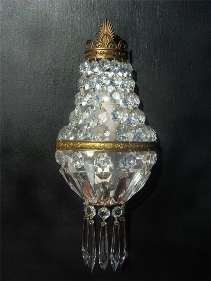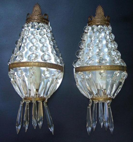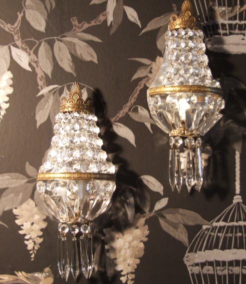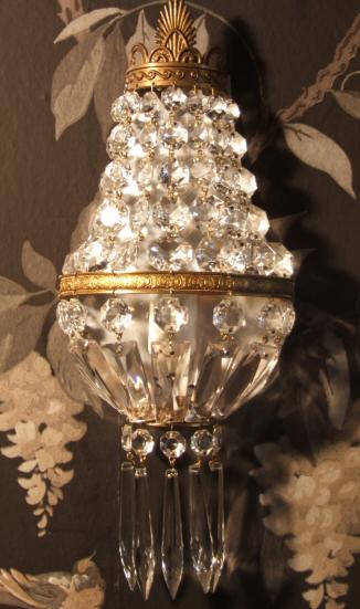 Stunning pair of French antique purse wall lights A beautiful pair of matching wall lights dating to 1930 of French origin. The back plates on these being chrome to reflect the light thrown from the bulb which sits neatly behing the "bag" of crystal drops adorning the frame. The attractive brass frames with pretty detailing at the corona and the centre. Beautiful antique wall lights in excellent condition. Rewired and ready to install. H 35cms W 15cms Depth 8cms