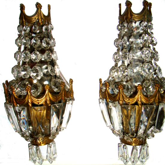 Stunning pair of French antique purse wall lights A beautiful pair of matching wall lights dating to 1930 of French origin. The back plates on these being chrome to reflect the light thrown from the bulb which sits neatly behing the "bag" of crystal drops adorning the frame. The attractive brass frames with pretty detailing at the corona and sweeping ribbon swags to the centre. Beautiful antique wall lights in excellent condition. Rewired and ready to install. H W Depth