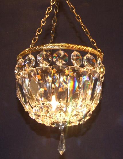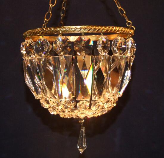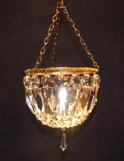 Small Edwardian crystal purse chandelier A small and very pretty Edwardian purse chandelier with rectangular coffin drops between graduated hexagonal crystals terminating in a glass rosette at the base to form a bag. This will hang directly over a light that is already in use as it has a slot in the brass hook to enable it to do this. Nice and simple in design. Height 13.25" min plus chain Width 6.25" Price £145