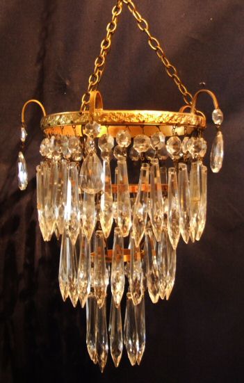 Beautiful pair of Edwardian 3 tier icicle drop chandeliers A lovely pair of period Edwardian chandeliers, dressed with 3 tiers of sparkling faceted icicle dops, the pretty brass rim is beautifully patinated and these period light fittings are becoming increasingly difficult to source. Rewired and ready to install. Width 7.5" frame, Height to rim 11.5...plus fitment and chain Price £450