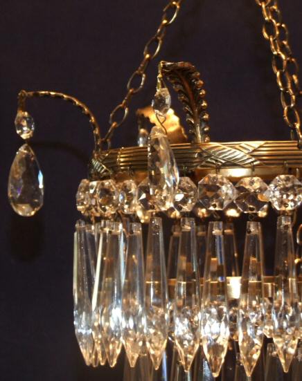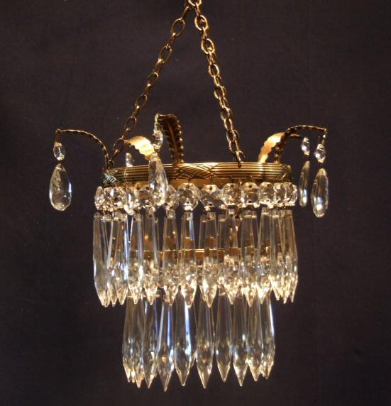 Edwardian 2 tier icicle chandelier A lovely little Edwardian 2 tier icicle drop chandelier, the pretty brass frame dressed with 5 brass ears and almond faceted drops. This lovely chandelier sparkles beautifully when the light is on. Rewired and ready to install. Height 9" min to frame but need to add extra for light fitment and chain Width 6" frame, including ears 9" Price £185