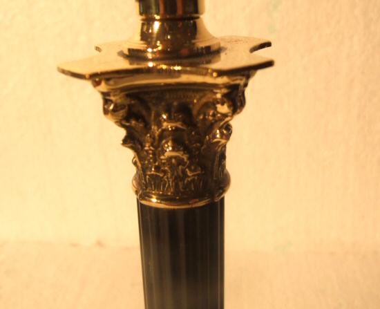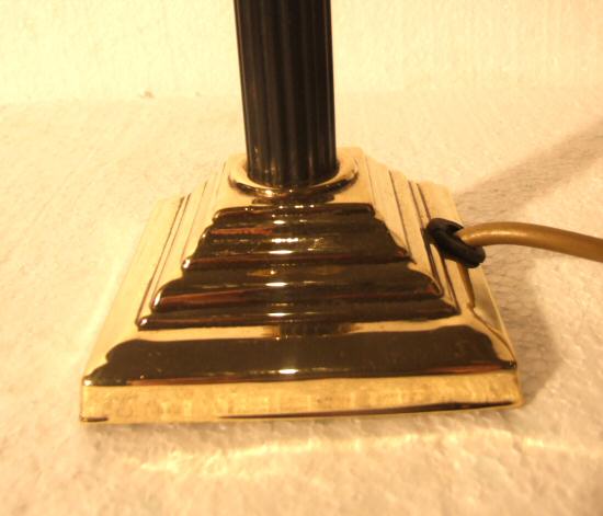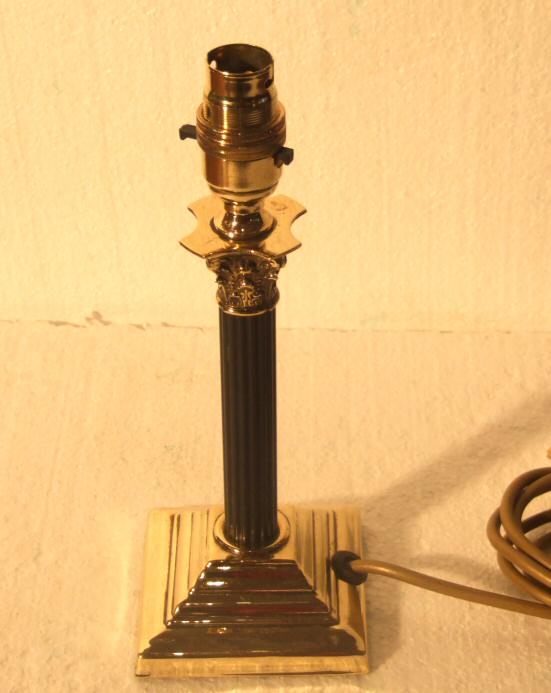 Beautiful small Edwardian brass Corinthian column table lamp An attractive small Edwardian brass Corinthian column table lamp with ebonised reeded circular stem raised on a stepped base with accanthus detailing to the top. Price includes a new cream shade and comes rewired and ready to use. Height 10" plus shade Width of base 3.75"" Price £155 (Ref:CHA600) |