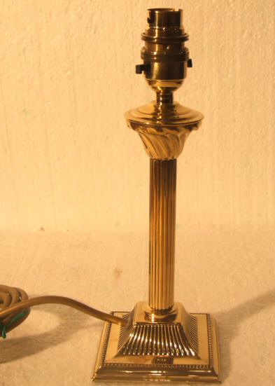 Beautiful small Edwardian brass table lamp An attractive small Edwardian brass table lamp with reeded circular stem raised on a stepped and reeded base with circular reeding detailing to the top. Price includes a new cream shade and comes rewired and ready to use. Height 10" plus shade Width of base 3.5" Price £145 (Ref:CHA601) |