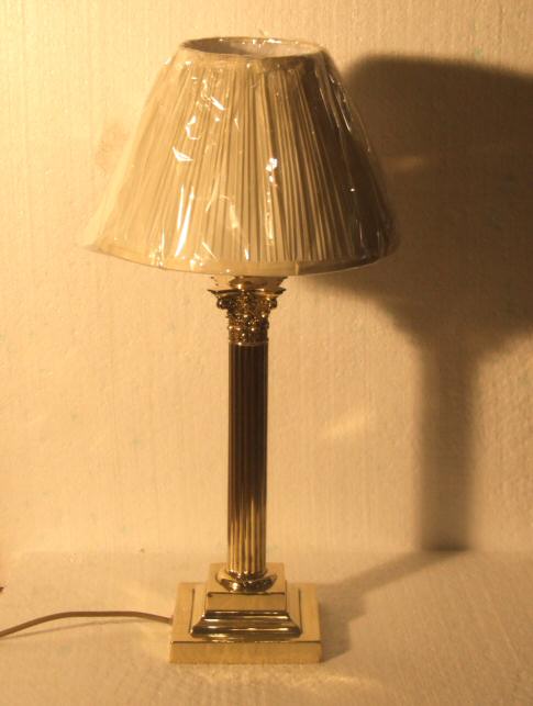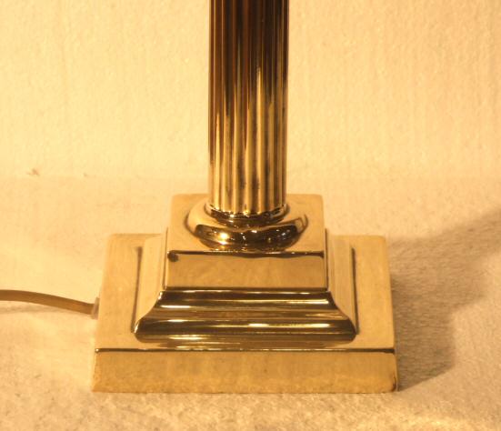 Large Edwardian brass table lamp A beautiful impressive large brass Edwardian table lamp on stepped base with large reeded stem (1.5" wide) and accanthus detailing to the top. This wonderful lamp comes with new cream shade and is rewired and ready to use. Height 23" inc shade Width of base 6" Price £275 (Ref:CHA602) |