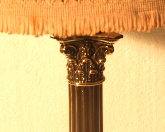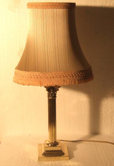 Very Large Edwardian Corinthian column brass table lamp An Impressive very large and heavy Edwardian Corinthian column brass table lamp with reeded circular stem raised on a stepped base with accanthus detailing to the top. A beautiful period lamp, comes complete with a large peach pleated shade which is optional also comes rewired and ready to use Height 28" inc shade Width of base 6" Price £285 (Ref:CHA604) |
