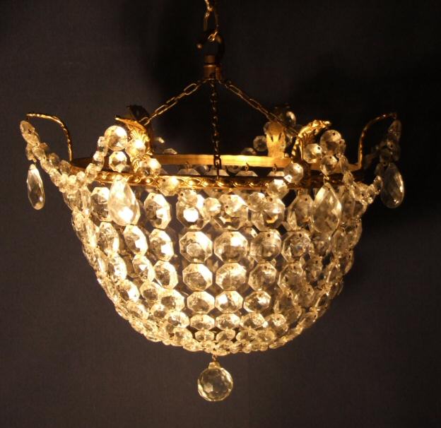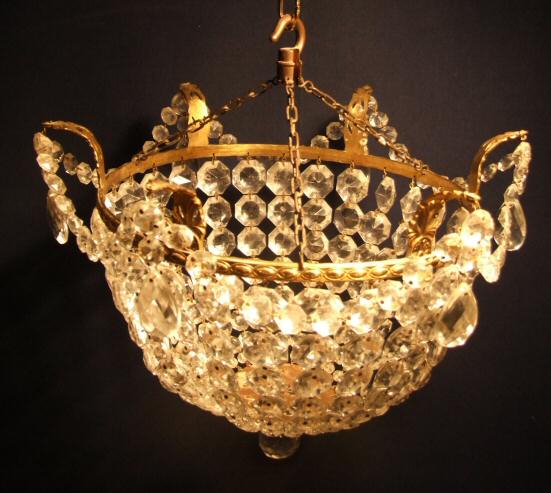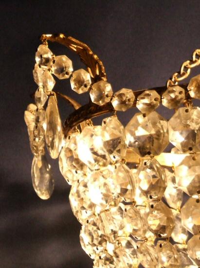 Beautiful pair of Edwardian 3 purse chandeliers A lovely pair of Edwardian chandeliers, these are so pretty, the graduated hexagonal drops meet at the base of the chandelier to form a bag shape and terminate in a faceted glass ball. The brass frame has 6 attractive accanthus leafs with garlands of crystals dressing each leaf with further faceted pear drops to each leaf. Totally beautiful and unbelievably hard to find as a pair, these come fully wired and ready to install. Width 12" inc leafs, Height 13" min plus chain Price £650