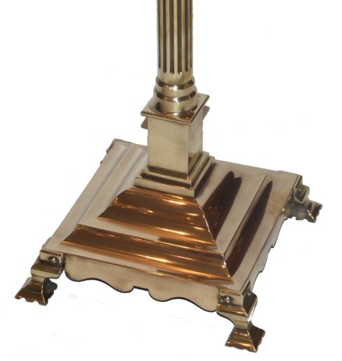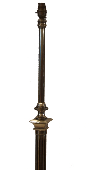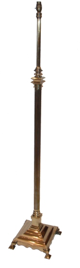 Edwardian brass standard lamp An attractive solid brass Edwardian standard lamp having been professionally polished to highlight the excellent detailing. Standing on square stepped base with pretty shaped feet, supporting the corinthium column reeded stem with adjustable slender brass section terminating in the bayonet. A beautiful period antique standard lamp rewired and ready to grace your home. Height 59" Width 11.5" (Ref : CHA62) Email Us for a delivery quote : Click Here