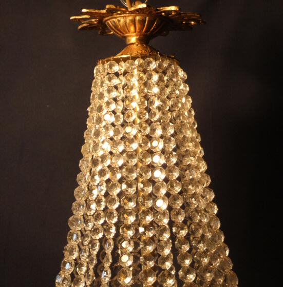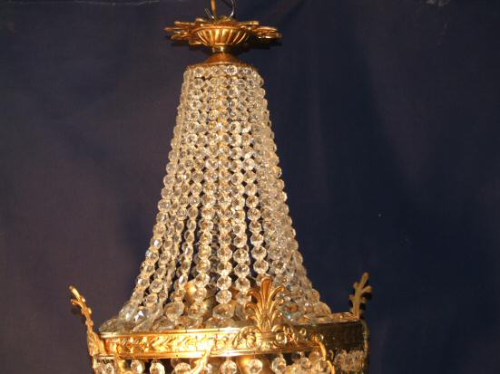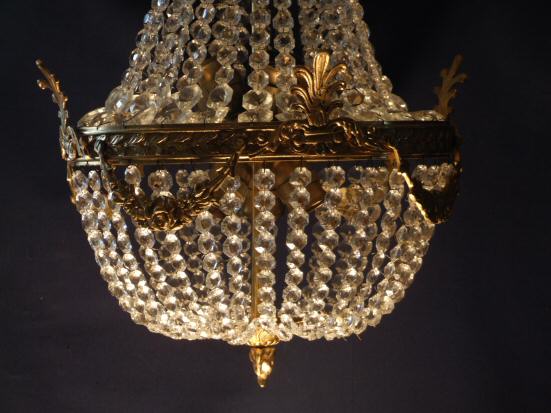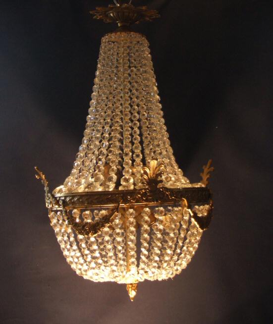 Stunning Large Antique Empire style purse chandelier This absolutely fabulous example of antique Empire style chandelier oozes grace and quality. The highly polished brass frame is dressed with ribbon swags, the brass ceiling rose large and impressive allows this to be hung directly to a ceiling hook or to have chain added to allow it to be placed at the desired height. Large and impressive this certainly makes a statement. The neck is elegant and long, the purse shape full and sparkling loaded with graduated hexagonal crystals. Beautiful from which ever angle it is viewed at. Rewired and ready to install. Width 17" Height 26.5" minimum plus chain and ceiling rose £795 (Ref : CHA623) Email Us for a delivery quote : Click Here