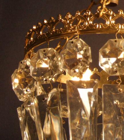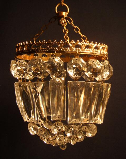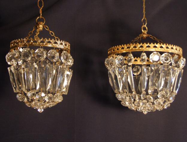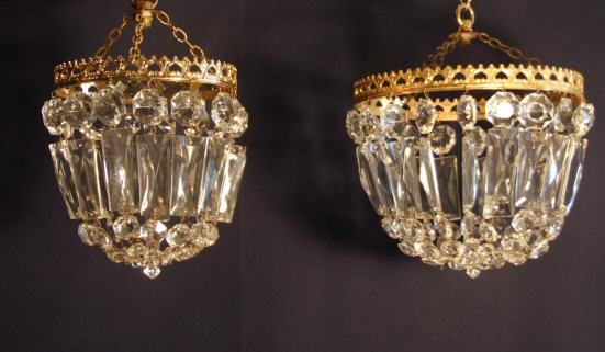 Near matching pair of antique purse chandeliers These pretty antique purse chandeliers are almost identical, the only difference being the width, one being 6" wide and one being 8", apart from this the lovely bright decorative gilt frame on each chandelier supports the purse shape formed by hexagonal faceted drops and rectangular faceted drops. Easy to alter the height of these by adding more chain making them ideal for any type of propery, modern or Period. Width 8" and 6" Height 10" minimum plus chain £350