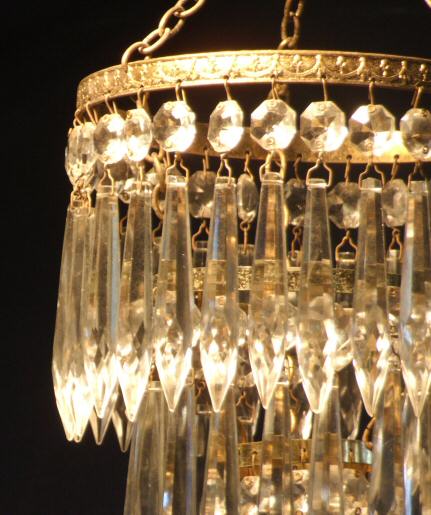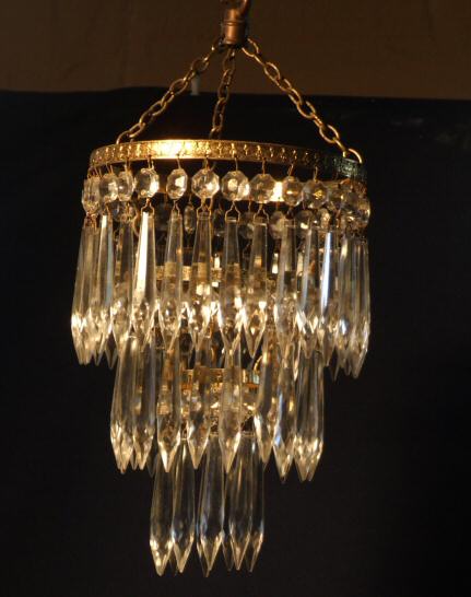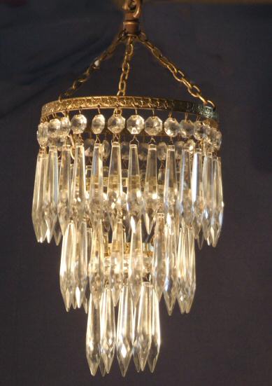 Small Edwardian 3 tier icicle drop chandelier A small and very pretty Edwardian 3 tier icicle drop chandelier, the 3 rows of faceted icicle drops dressing a pretty gilt frame with ribbon swag decoration. Rewired and ready to install this is ideal for smaller dark areas that need a little extra light and sparkle. Height 12.75" min plus chain Width 6.25" Price £155