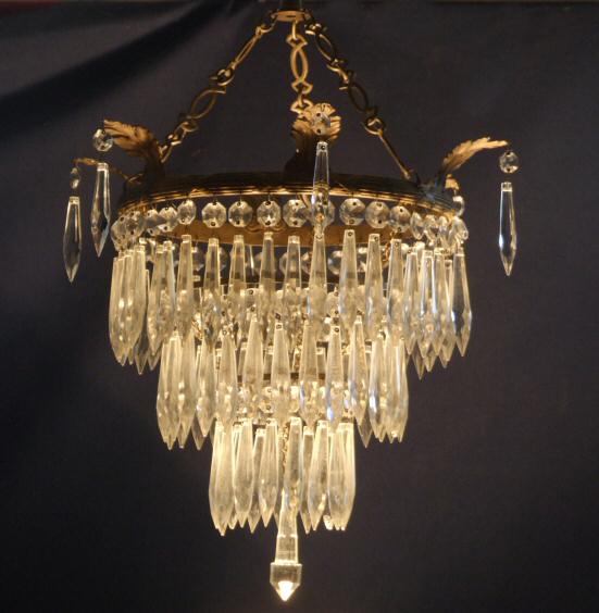 Absolutely stunning 3 tier Edwardian crystal chandelier This beautiful chandelier dates to 1900 and oozes quality and charm, the beautiful frame having well defined oak leaf decoration with extra icicle drops to add a little more glamour, the frame has 3 rows of icicle drops and one larger unusual and very attractive drop to the bottom, In addition to this wonderful chandelier is the original and extremely attractive chain which is an unusual feature on these style of chandeliers. Really beautiful and will certainly add the wow factor. Rewired and ready to install. Height 17" inc original chain Width 12" inc ears Price £325