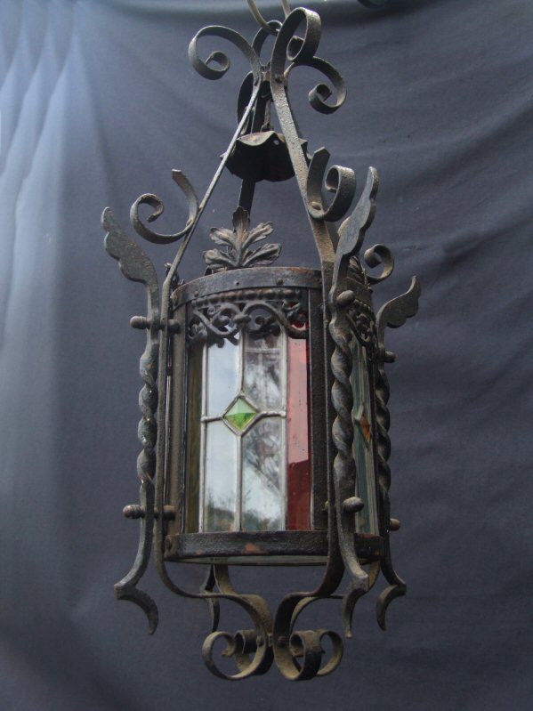 Victorian Cylindrical Wrought Iron Stained Glass Lantern
