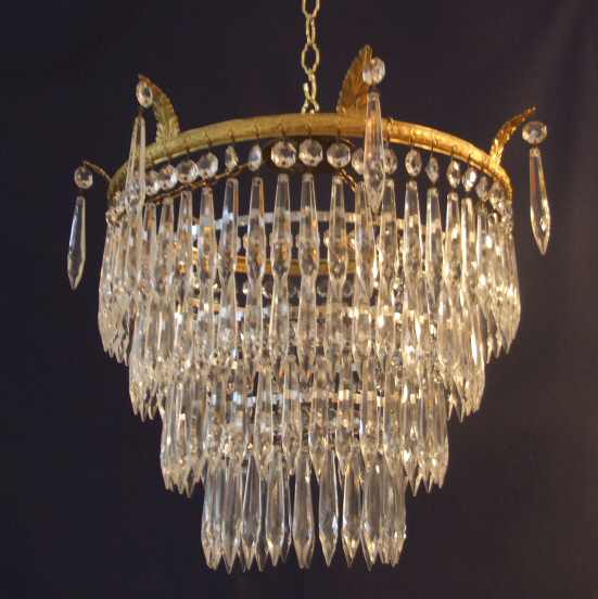 Large Impressive 4 tier "Icicle" drop antique chandelier This wonderful 4 tier "icicle" drop chandelier dates to the turn of the Century and has a lovely wide gilt frame with 7 acanthus leafs decorating it from which 7 further "icilcle" drops are displayed. This is a very full and impressive chandelier and sparkles beautifully even when unlit. A lovely example having 4 tiers as opposed to the more widely found 3 tier examples. Height 13" plus chain Width 13" SOLD (Ref: CHA72)
