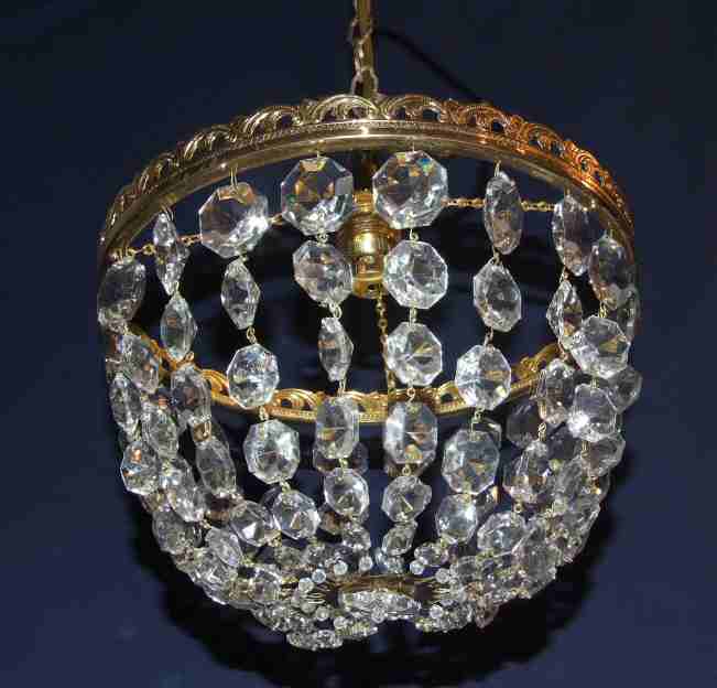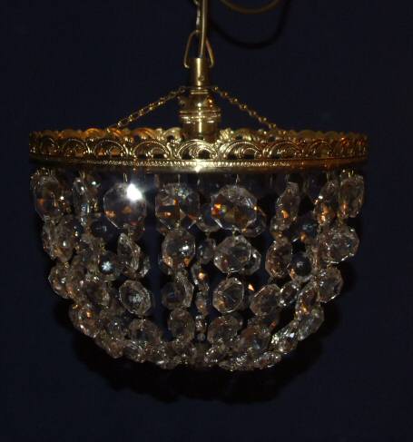 Lovely antique bag chandelier This pretty mid 20th Century single bulb chandelier is of purse construction, the attractive gilt frame of foliate design is decorated with hexagonal flat back glass drops which as you can see from the picture give a lovely rainbow effect, they are all held in place by a brass rim and small glass decorative glass flower drop. This is a nicely proportioned chandelier and is provided rewired and ready to hang. Width 10.5" Drop 8.5" plus chain PRICE £250 (Ref : CHA80) Email Us for a delivery quote : Click Here