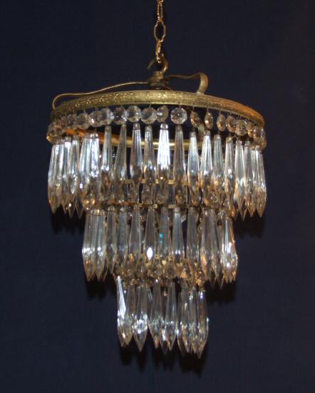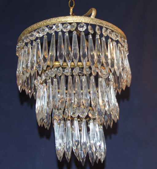 Attractive Edwardian 3 tier waterfall chandelier Dating to circa 1900 this lovely 3 tier antique chandelier is ideal for most ceiling heights, the classic gilt frame is dressed with 3 rows of "icicle" drops and sparkles beautifully. Rewired and ready to hang this will transform your room immediately. Height 14" plus chain Width 10" PRICE £295 (Ref : CHA81) Email Us for a delivery quote : Click Here