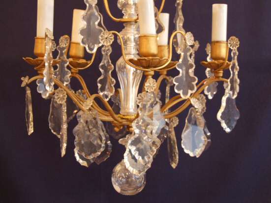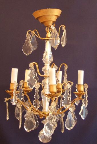 Louis XV style French Antique Chandelier Dating to Circa 1900 this lovely example of a French Louis style Chandelier is full of character and charm. The drops are particularly nice and unusual on the chandelier and the glass stem is slender and slightly curvaceous giving it a little extra something special. Having 5 brass arms and a nicely proportioned frame this chandelier comes to you fully rewired with all the drops checked and in fantastic condition. Height 24" minimum including original brass ceiling rose.. Width 14" sold