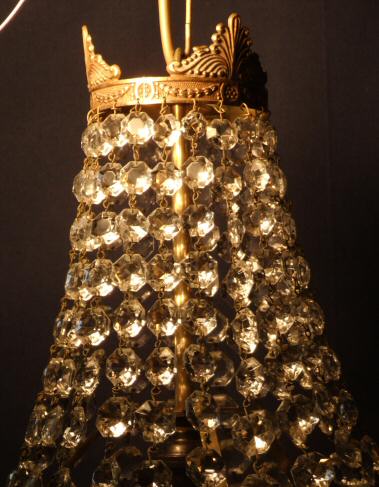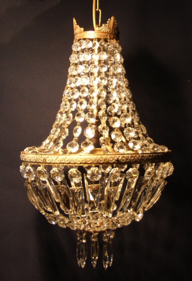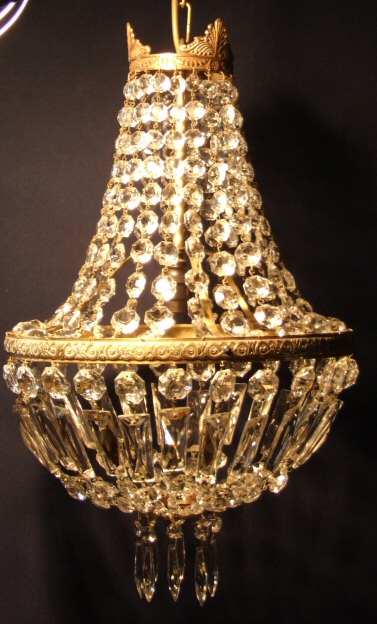 Antique Empire style purse chandelier A lovely simple example of a Regency style purse chandelier dating to 1930, this elegant style of chandelier has been found since the Georgian era, the slender graduated crystal drops dress the corona of this lovely piece and form the neck of the chandelier, the bag is formed from hexagonal faceted crystal drops and rectangular drops which collect at the base to form a purse shape, finished with lovely icicle drops. This lovely antique chandelier will come fully rewired and ready to install. Width 12" Height 20" minimum plus chain and ceiling rose £395