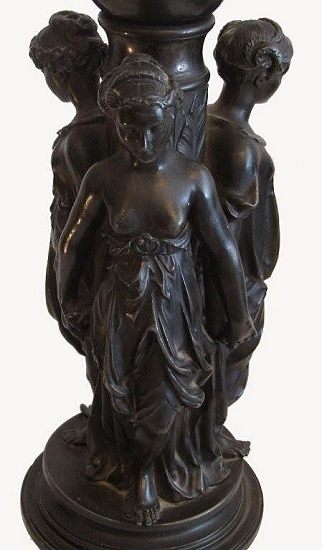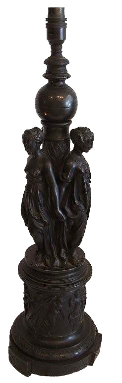 A large and impressive Edwardian spelter figural lamp. Three scantily dressed maidens back to back form the stem of this most unusual table lamp standing on a large plynth decorated with dancing maidens. A unique and wonderful addition to any room. height 29" plus bulb Base 9" Rewired SOLD Email Us for a delivery quote :Click Here (Ref : CHA40)