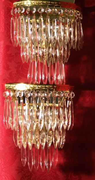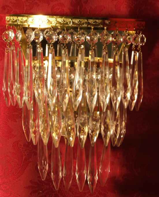 A beautiful pair of mid 20th Century wall lights with mirror backs. These lovely lights have 3 rows of icicle drops dressing a bright gilt frame.