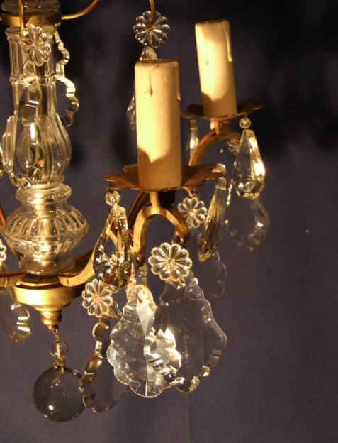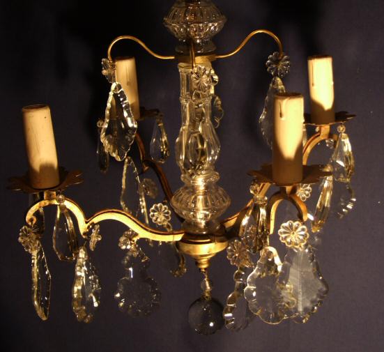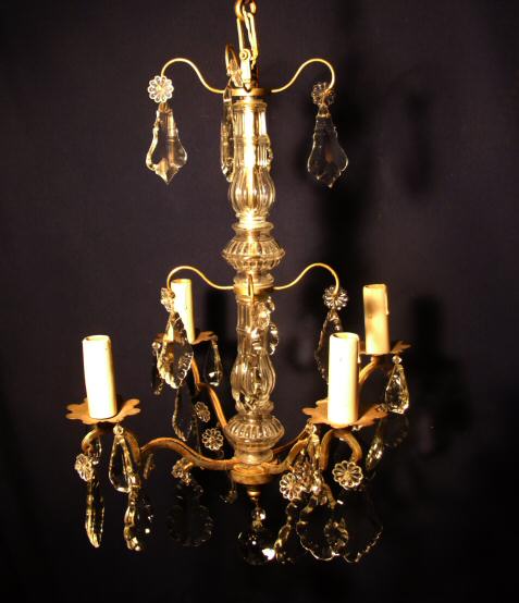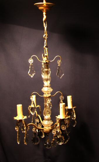 Circa 1900 elegant French 4 arm chandelier A beautiful, slender, elegant 4 arm chandelier from France dating to 1900, glass stem with brass arms dressed with faceted French drops and original brass rose. Rewired and ready to hang. min height 19.5" Height including original chain and rose...29.5" can be altered