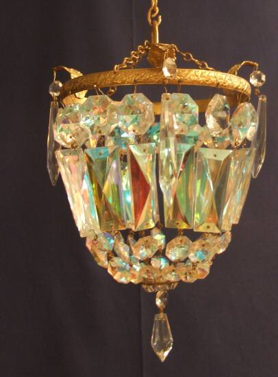 Attractive petite antique chandelier Mid 20th Century "purse" style chandelier with rectangular and hexagonal glass drops which have a rainbow effect. The gilt frame with 3 acanthus leafs and extra decorative "icicle" drops make this a very compact and attractive light ideal for the smaller home with lower ceilings. Height 11" Width 9" SOLD (Ref : CHA79) Email Us for a delivery quote : Click Here