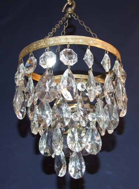 Attractive petite antique chandelier Circa 1900, this lovely little chandelier with single bulb has pretty wide brass rim and 4 tiers of faceted almond drops all in lovely condition. A full and compact chandelier perfect for lower ceilings. Height 9" Width 8.25" PRICE £195 (Ref : CHA82) Email Us for a delivery quote : Click Here