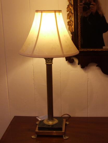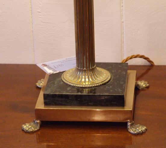 Large and decorative Corinthian column table lamp on lion paw feet. A beautifully decorative antique Corinthian column table lamp in brass on attractive square brass base with onyx inset standing on 4 well defined lion paw feet. The circular reeded stem terminating in well defined acanthus capital with new cream shade. Base 8" PRICE £180 (Ref:CHA85) Email Us for a delivery quote : Click Here