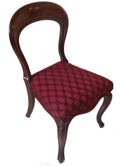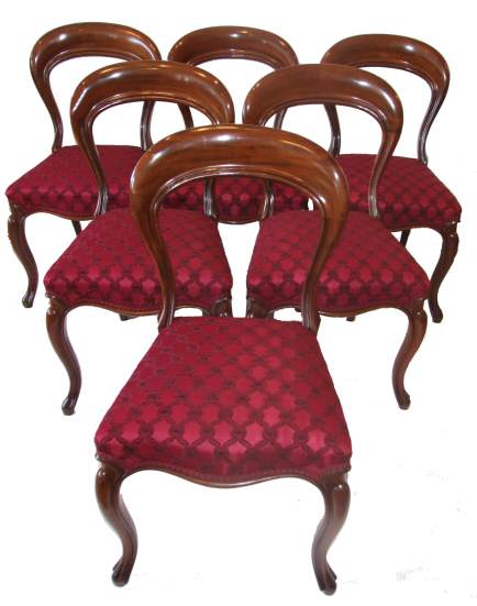 Set of 6 Victorian balloon back dining chairs These are a fabulous set of 6 Victorian balloon back dining chairs, a far more substantial design than usual balloon backs and much more sturdy. Highly figured balloon backs, serpentine seats, beautiful cabriole legs. These chairs have been put through the workshop and stripped to bare frames prior to clamping as necessary, traditionally polishing, waxing and reupholstering. They have been covered in a beautiful quality damson material which work well with the show wood frames. Price £2400 (Ref:D161) Email Us for a delivery quote :Click Here