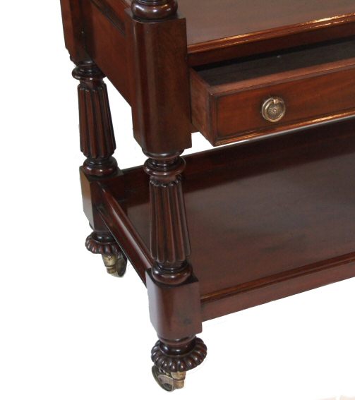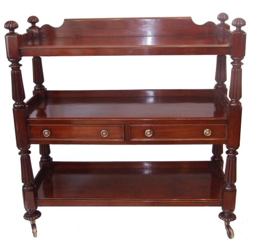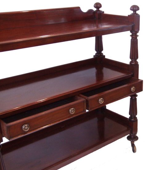 W1Vth mahogany highly figured buffet This exceptional quality W1Vth mahogany buffet is in excellent condition, very solid in construction, the 3 shelves providing excellent surfaces for storage, the central shelf incorporating 2 useful drawers with brass handles. The upstands being reeded back and front make this perfect as a free standing piece in the middle of a room if so desired. The brass casters are supported by melon shaped lobed turnings and the whole piece is decorated with attractive lobed finials. Beautiful!