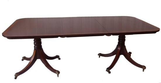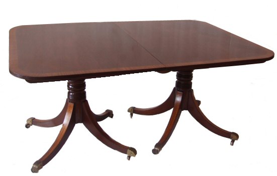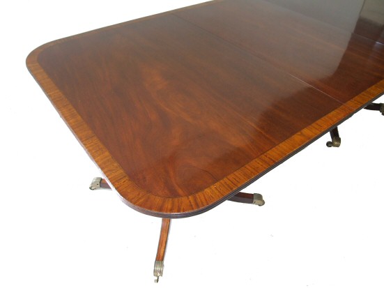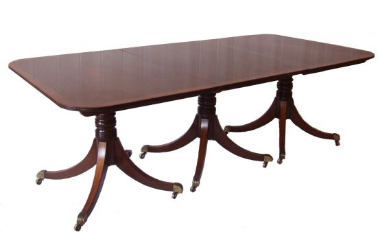 Regency Triple Pillar Mahogany Dining Table with satinwood banding Dating to 1800 this fabulous highly desireable triple pillar Regency dining table in highly figured mahogany has a thick band of decorative satinwood to the top and to the top surface of all the legs. The 3 pillars are raised upon 4 outswept legs each with satinwood veneer and ebony stringing to their tops terminating in brass reeded casters, on gun barrel turned stem. Having 2 extra leafs (possibly associated) this table will comfortably seat 14. It is a beautiful conker colour and presented in fabulous condition. The central and end sections with tilting mechanism means that this wonderful table can be used in many different ways. The triple pillars together with no leafs, the end sections together with no leafs and the central section stored in the upright, making this extremely versatile and perfect for the larger family special occasions. Excellent knee space and being 44" wide perfect for dining areas where a narrow table is needed. Extremely hard to find in this size and condition. Total Length 133.5" Width 44" Height 27.75" (2 leafs each measuring 22.75") Central section measuring 26.5" End sections measuring 30.75" and 30.5" sold Email Us for a delivery quote :Click Here (Ref :D166)